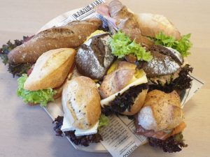 Sandwiches van mais, wit en waldkorn boerenbrood van de warme bakker (2 p.p.), belegd met gerookte zalm, humus met gegrilde courgette, belegen boerenkaas, gerookte kip met pesto, rundercarpaccio met pijnboompitjes en boerenham. Hierbij een kop soep van de dag. Inclusief jus d’orange